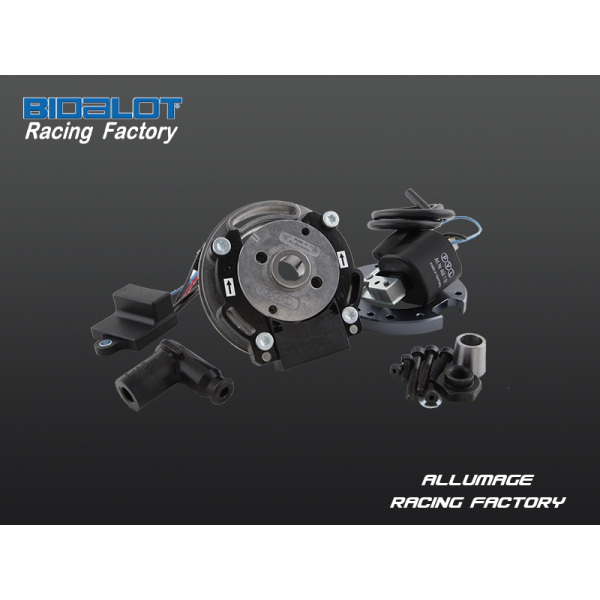Ce système d'allumage digital, à rotor interne, de fabrication allemande (PVL), est équipé de la courbe d'allumage Racing Factory, qui est le fruit de très nombreux essais sur banc d'essais ainsi que sur piste ( circuit ou runs).