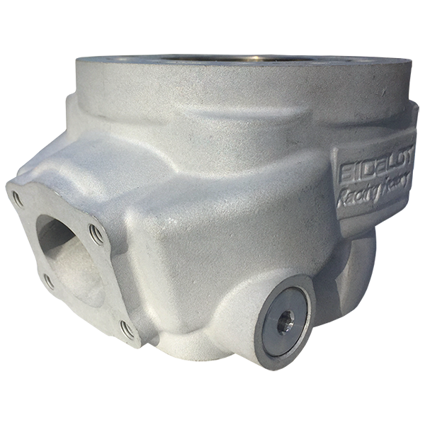 Le couvercle de culasse est lui aussi totalement usiné (CNC) sur des machines à commandes numériques de dernière génération. Il est anodisé noir, et est marqué du logo BIDALOT Racing Factory. Il est à noter que le couvercle dispose d'un perçage'taraudage M10x1.00, permettant le branchement d'une sonde de température. Un bouchon d'obturation est fourni d'origine, dans le cas d'absence de cette sonde.