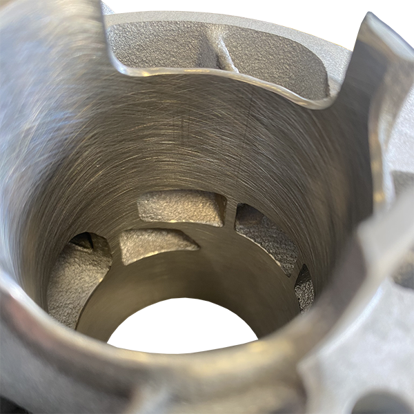 Entièrement modélisé en CAO 3D, le cylindre voit sa chambre d'eau faire le tour tous les noyaux de transferts et d'échappement, avec des épaisseurs constantes, à même de garantir une grande stabilité dimensionnelle du cylindre, due à un refroidissement optimisé.